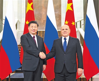 习近平指出,中俄是相互最大邻国,又是全面战略协作伙伴,保持中俄关系健康稳定发展,符合两国关系的历史逻辑和两国人民的根本利益。中国成功召开了中共二十大,前不久全国两会选举产生了新一届国家机构领导人,中国党、国家和人民空前团结,正在全面推进中国式现代化。中国新一届政府重视发展中俄全面战略协作伙伴关系,愿同俄方通过两国政府总理定期会晤等机制化交往渠道,推动实现两国合作新目标,取得更多新成果。