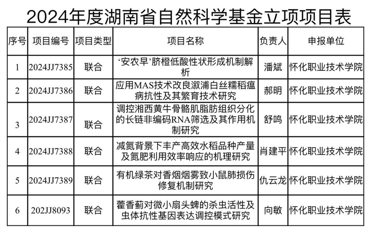 近日,湖南省科学技术厅发布《关于2024年度湖南省自然科学基金项目立项的通知》,我校《藿香蓟对微小扇头蜱的杀虫活性及虫体抗性基因表达调控模式研究》等6个项目进入公示名单,涉及杂交水稻、畜牧兽医、果树、茶叶等专业领域。本次项目申报及立项数目均创学校历史新高。
